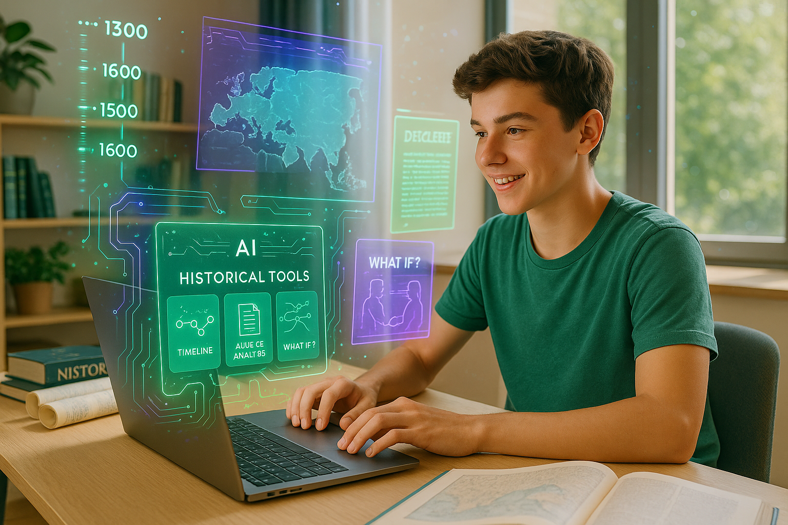 Zobacz, jak AI pomaga zrozumieć historię: timeline'y, konteksty, analizy źródeł i symulacje „co by było gdyby". Przewodnik dla uczniów i rodziców.