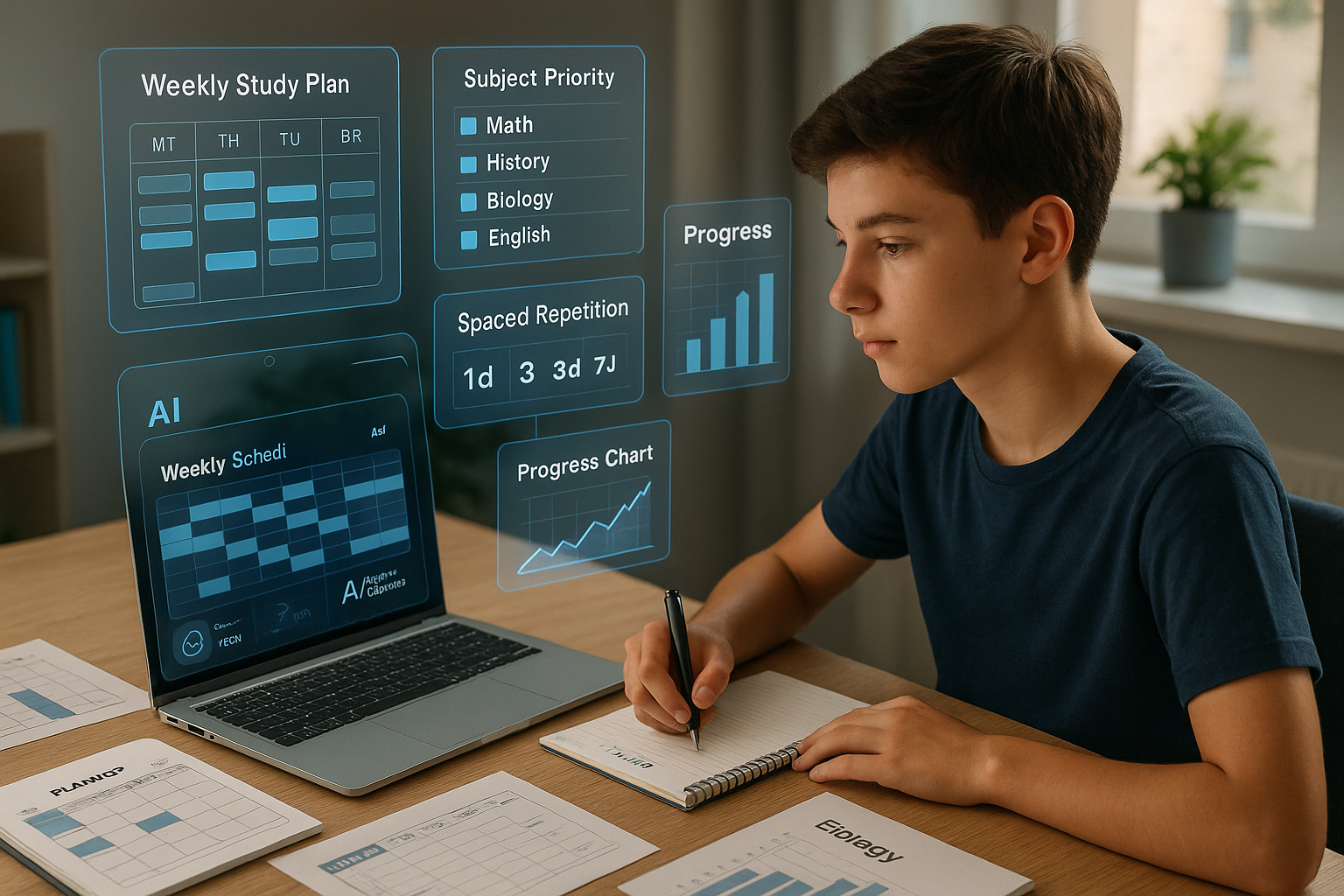 Zobacz, jak AI pomaga planować naukę i powtórki. Twórz spersonalizowany harmonogram, analizuj postępy i ucz się mądrzej, nie więcej.